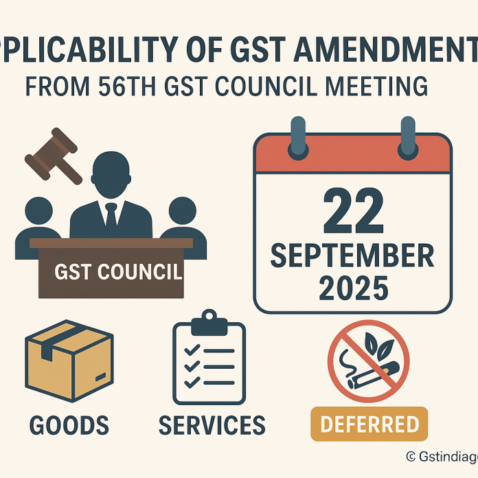 Amendments recommended by the 56th GST Council Meeting are generally applicable from 22 September 2025, except that tobacco-related goods will follow a deferred timeline, pending clearance of compensation cess liabilities.