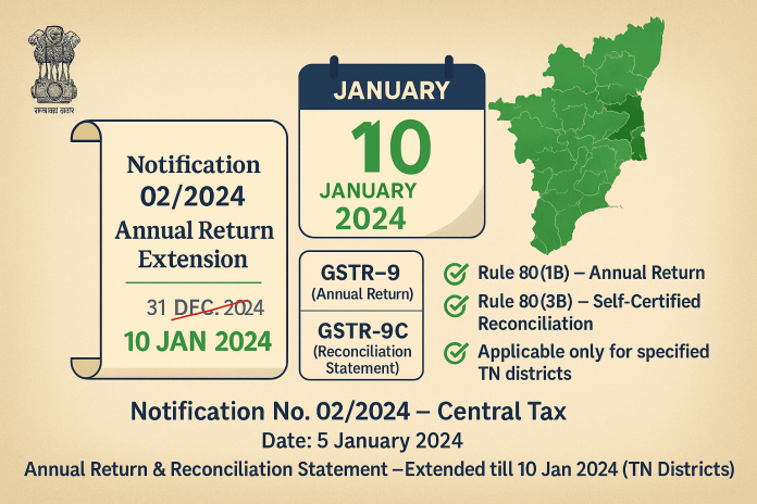 - Rule 80(1B) – Extension of due date for annual return (GSTR-9) for FY 2022-23 for specified districts in Tamil Nadu