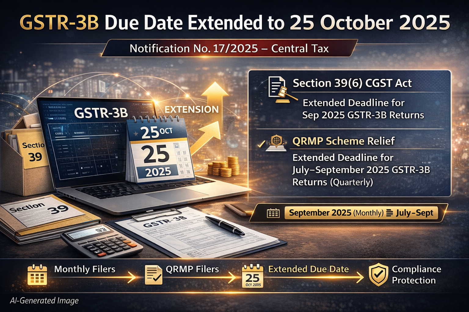 Further, the notification also extends the due date for furnishing FORM GSTR-3B for the quarter July 2025 to September 2025 for taxpayers filing returns under the proviso to Section 39(1) (QRMP Scheme) up to 25th October 2025. This ensures parity of compliance relief between monthly filers and quarterly filers and provides necessary administrative flexibility to registered persons covered under the QRMP mechanism.